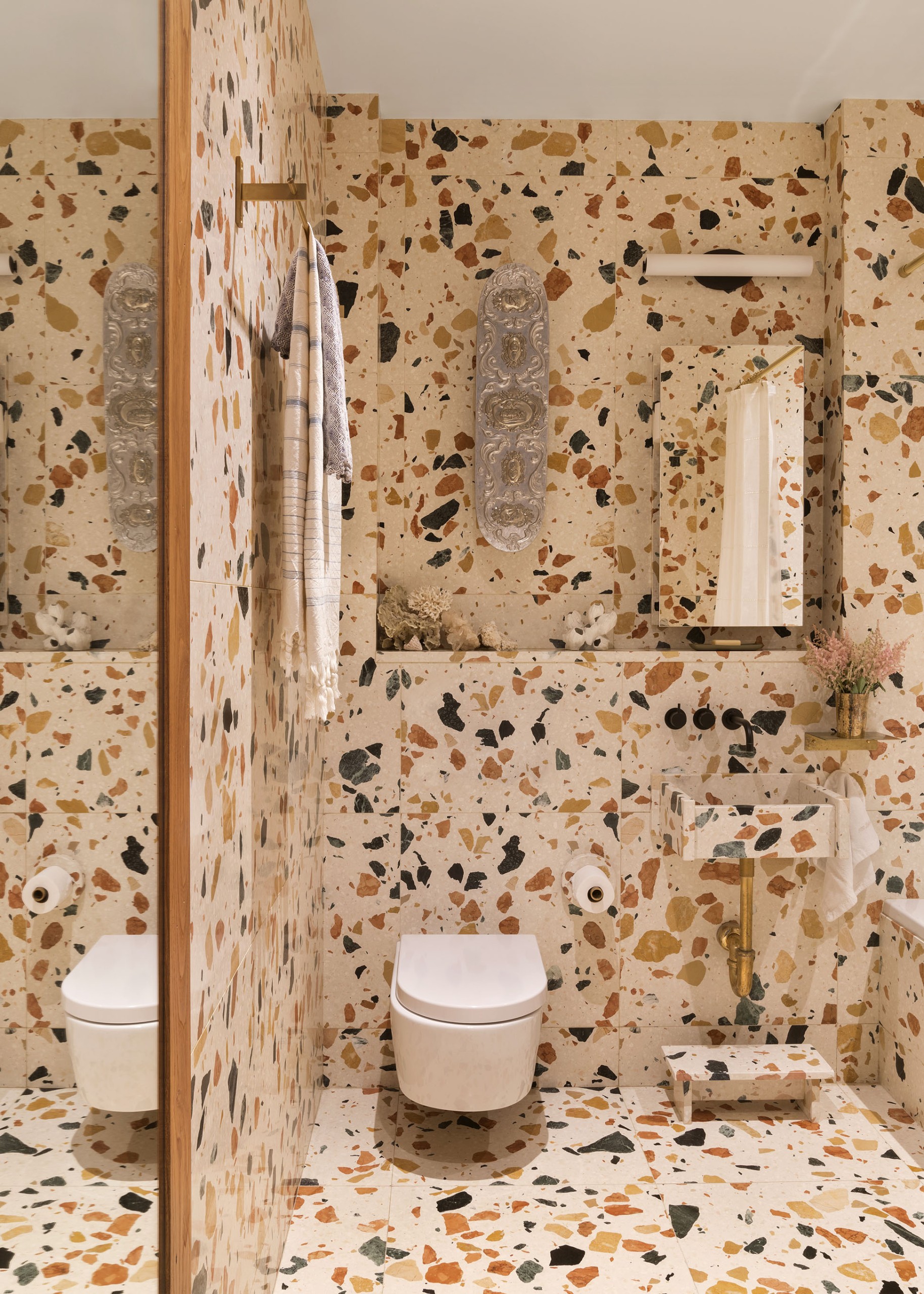 The apartment had its structural quirks. It was long and narrow, but also had exceptionally high ceilings and big, south-facing windows (partially blocked by air-conditioning units). But we sensed immediately how to make it work and had the design for the remodel ready within days. I’d just been in Milan for the Salone del Mobile, too, where I saw a presentation of a new terrazzo-like engineered material called Marmoreal created by the English designer Max Lamb for my former colleague Brent Dzorckius’s company, Dzek. By the time we closed on the apartment just a few weeks later, we were already ordering slabs of this new nougat full of bright chips of colored marble to tile our new bathrooms. The process was fluid and easy—a clear sign that we were both ready for this change.